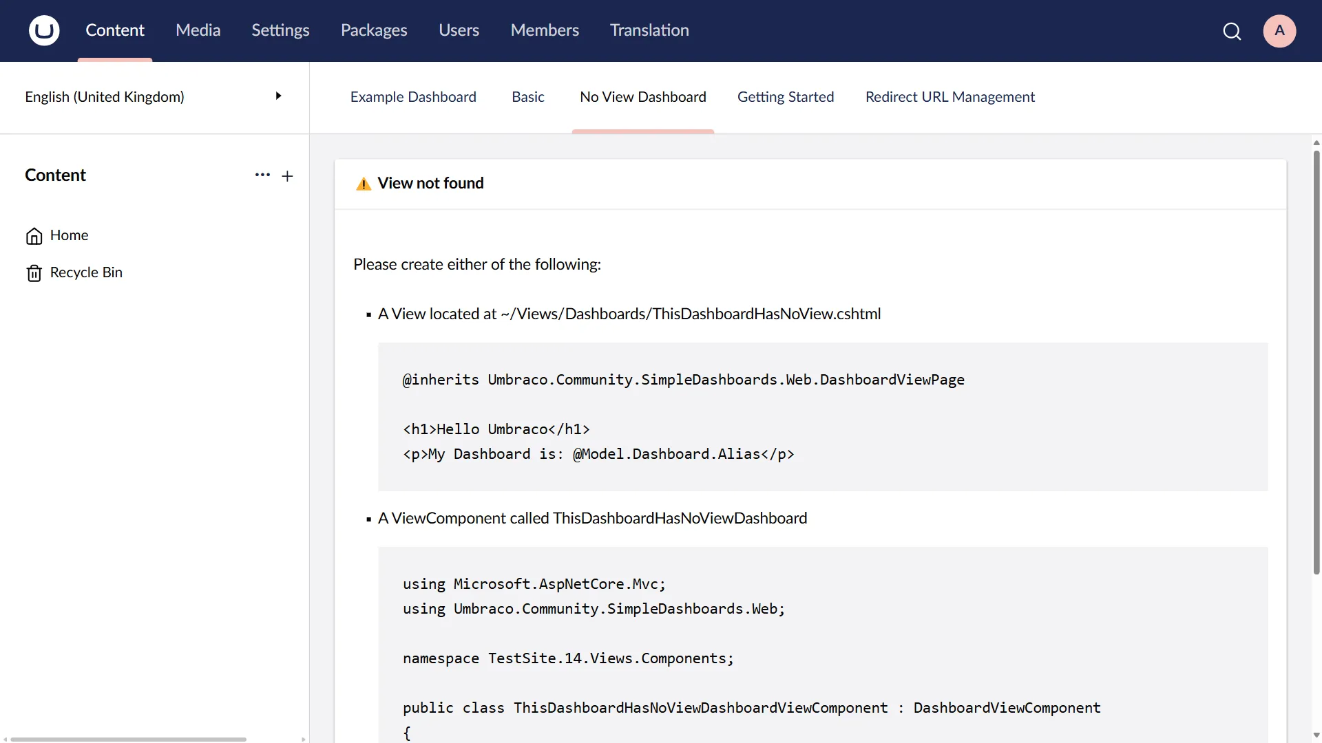 using Umbraco.Community.SimpleDashboards.Web;public class BasicDashboard : SimpleDashboard { }Create View
